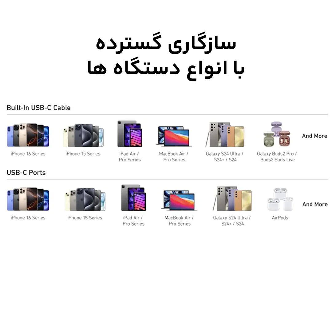 - دارای 3 خروجی: یک خروجی کابل تایپ سی + یک خروجی پورت تایپ سی + یک خروجی USB-A