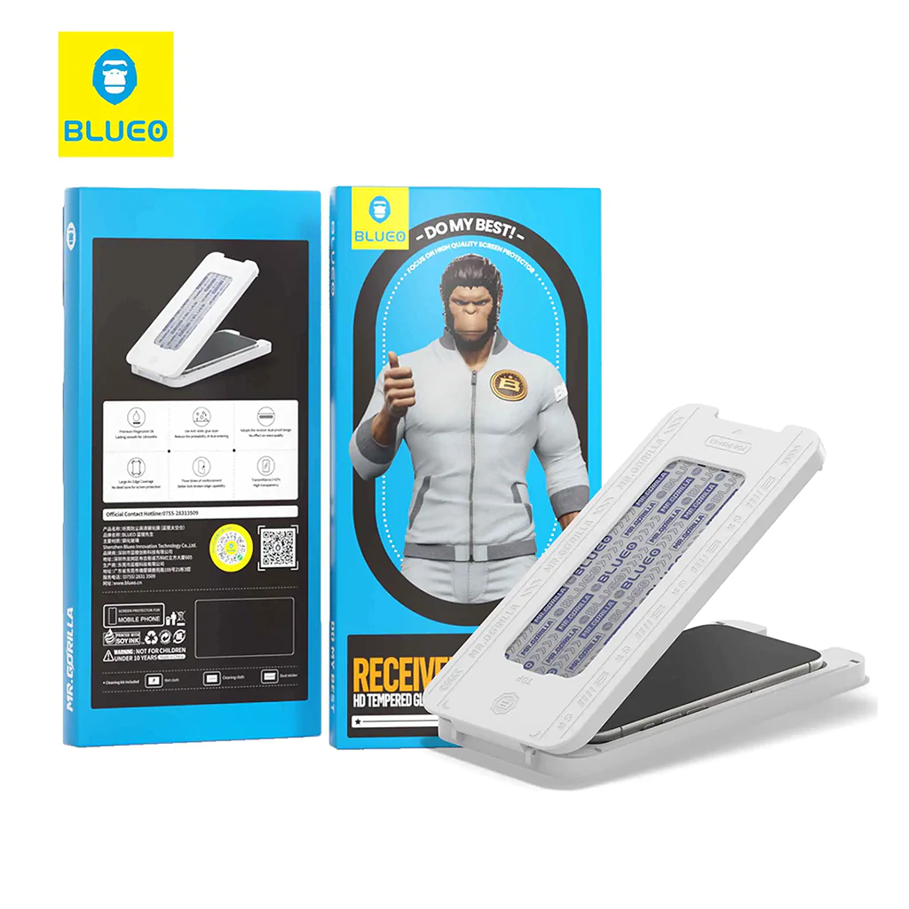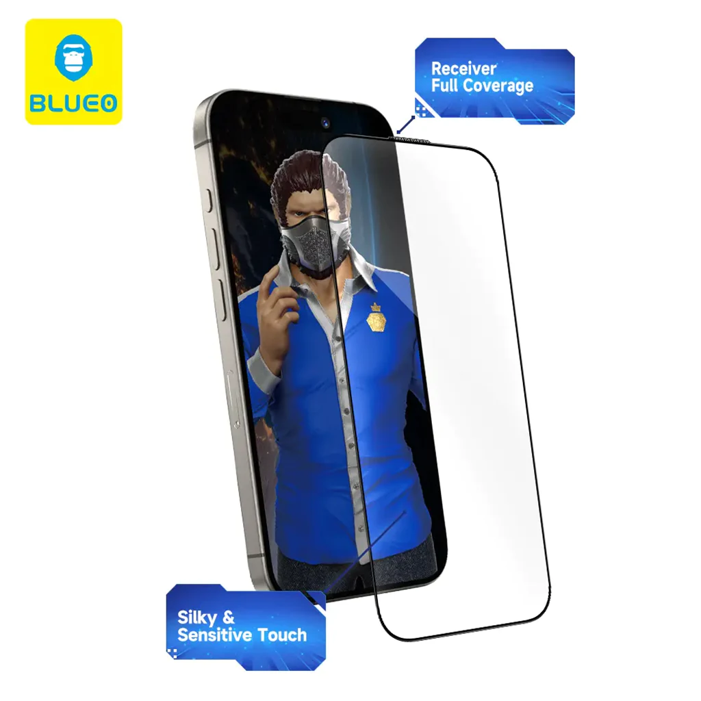 گلس محافظ صفحه شفاف با کیت نصب اتوماتیک آیفون 16 و 15 بلوئو BLUEO 9H Receiver Dustproof Glass iPhone 15/16
