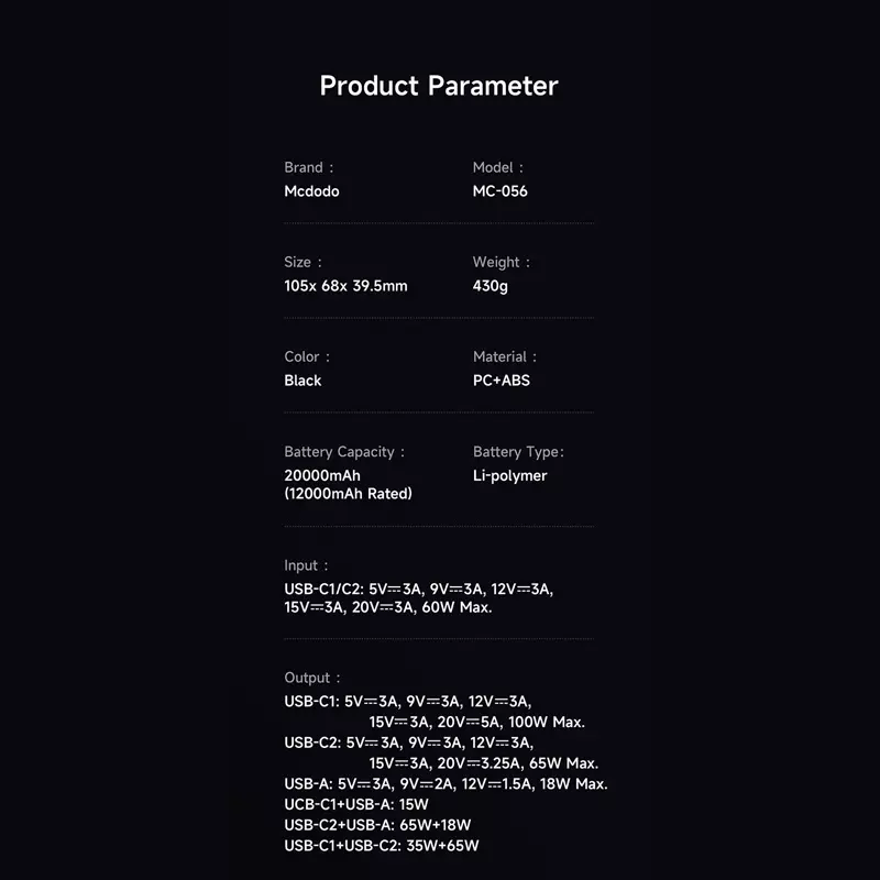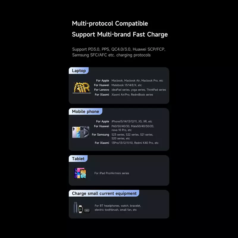 - حداکثر توان شارژ 100 وات با پشتیبانی از تمامی فناوری های شارژ سریع (PD، PPS، QC3.0، FCP، AFC، SCP، PD 3.0، QC 4.0)