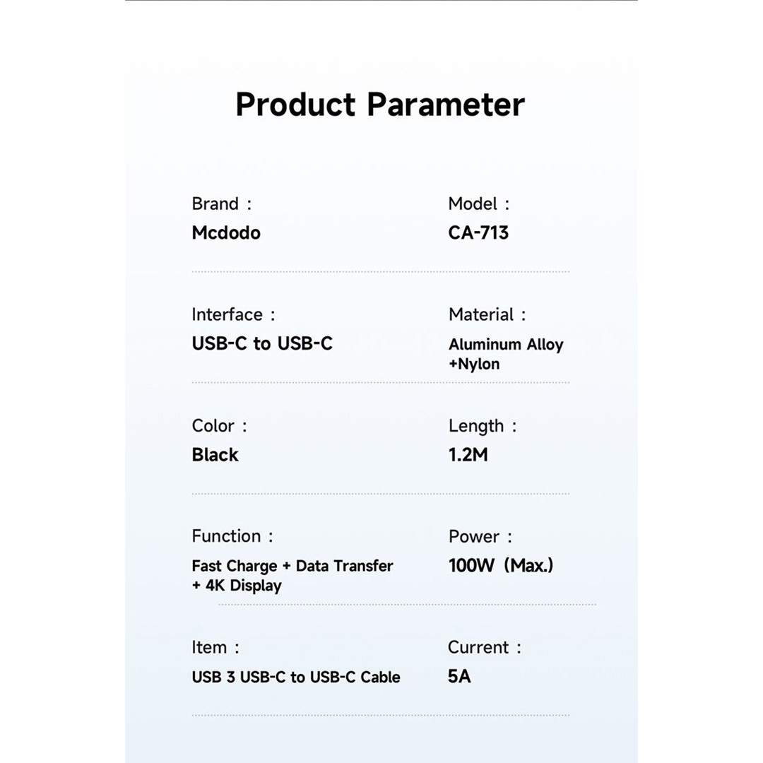 کابل شارژ تایپ سی و انتقال تصویر 100 وات مک دودو USB3 CA-7132 طول 1.2 متر
