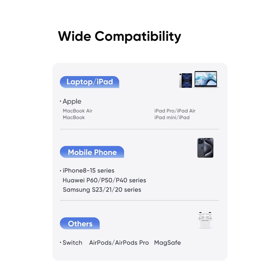 - سازگار با لپ تاپ مدل مک بوک ایر، مک بوک، آیپد مدل آیپد پرو، آیپد ایر، آیپد مینی، گوشی های موبایل آیفون 8 تا 16، هواوی P60، P50 و P40 و سامسونگ مدل S23، S24، S25، S22 و S20 و ایرپاد