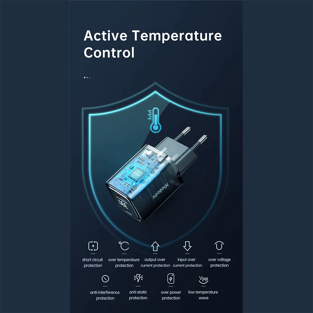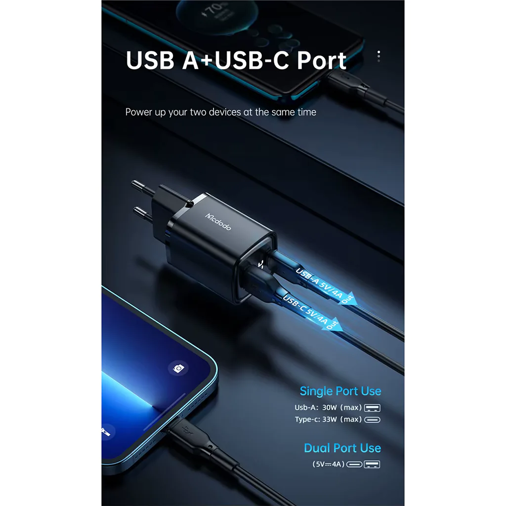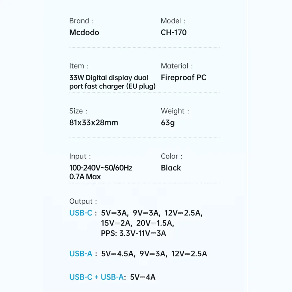 Mcdodo 33W Digital Display PD Dual Output USB-C & USB-A Fast Charger CH-170 EU Plug 2 Pin