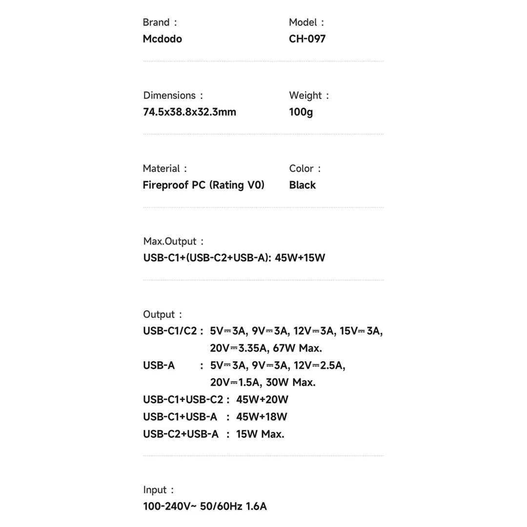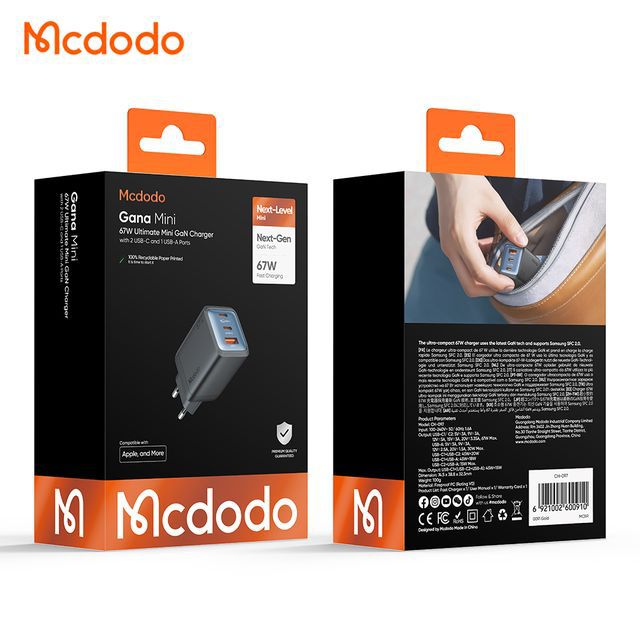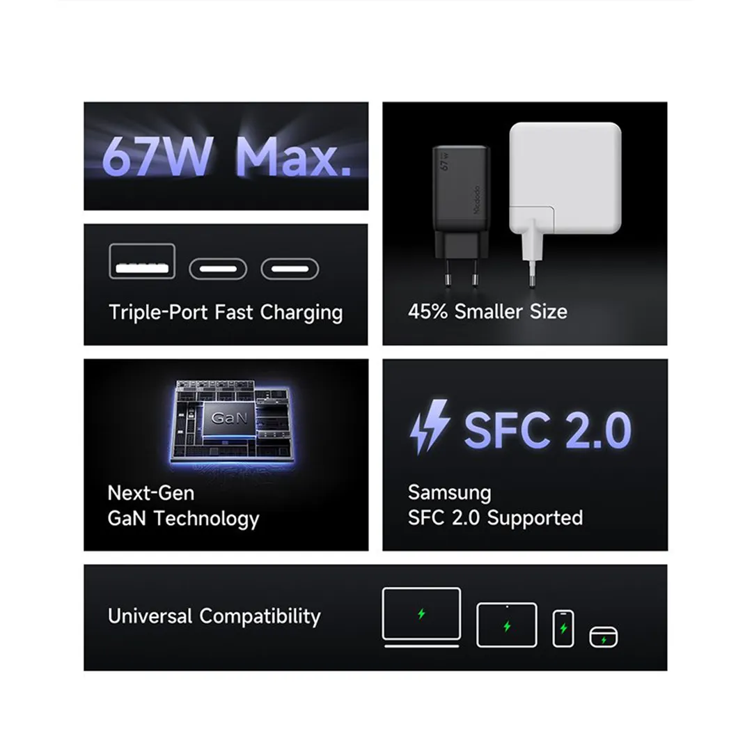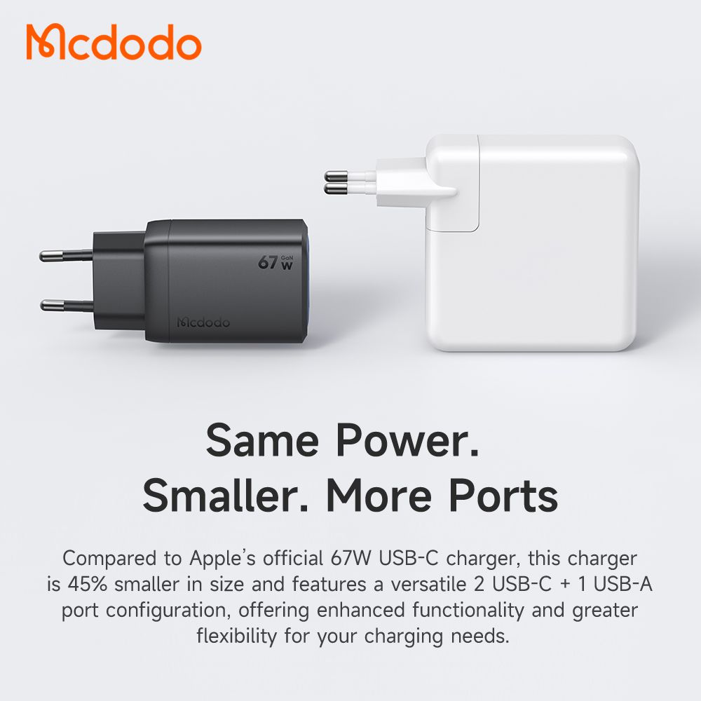 Mcdodo 67W Gana Mini 3-Output USB-C & USB-A Fast Charger CH-097 EU Plug 2 Pin