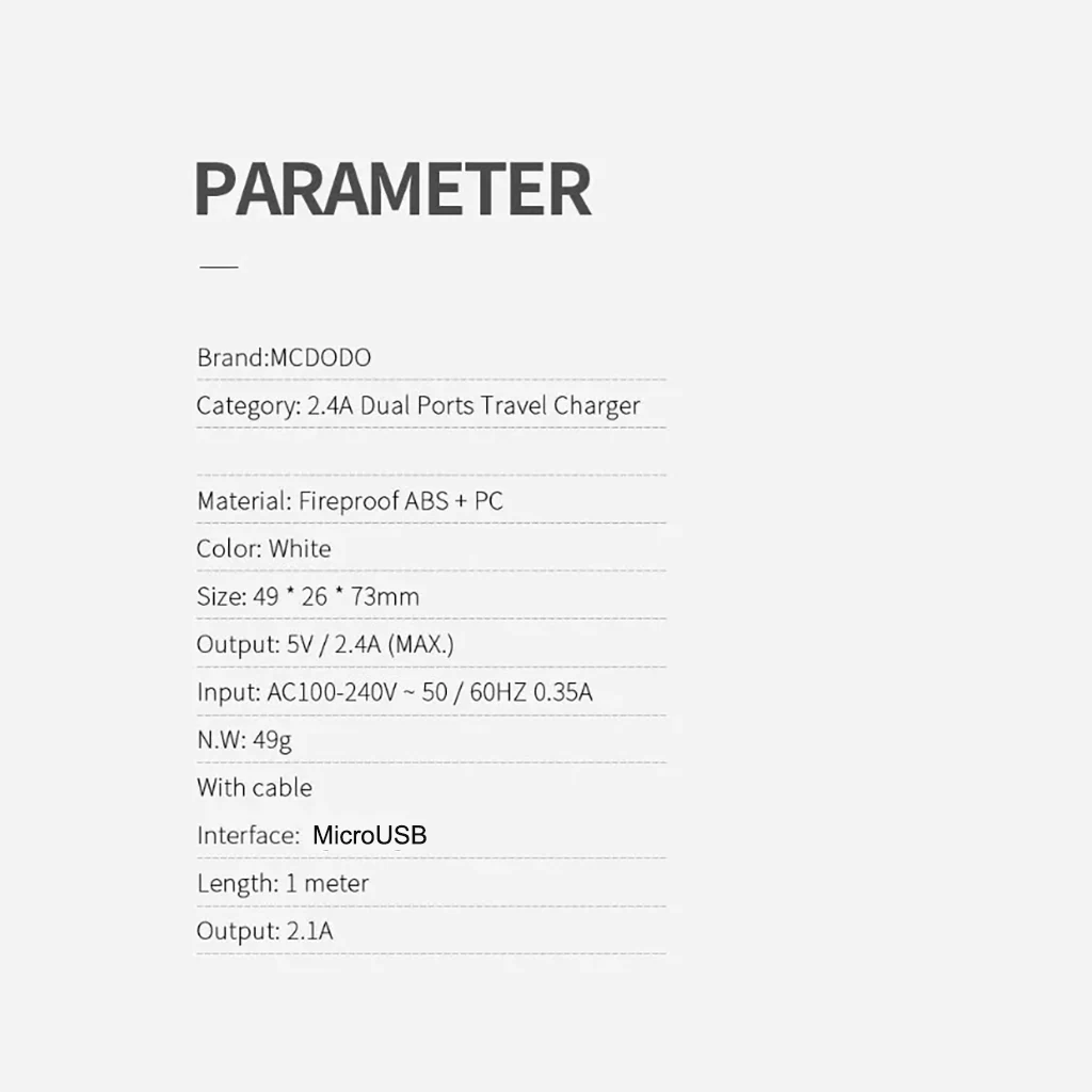 Mcdodo Dual USB-A Output 12W Travel Charger Set with MicroUSB Cable CH-3971 EU Plug 2 Pin