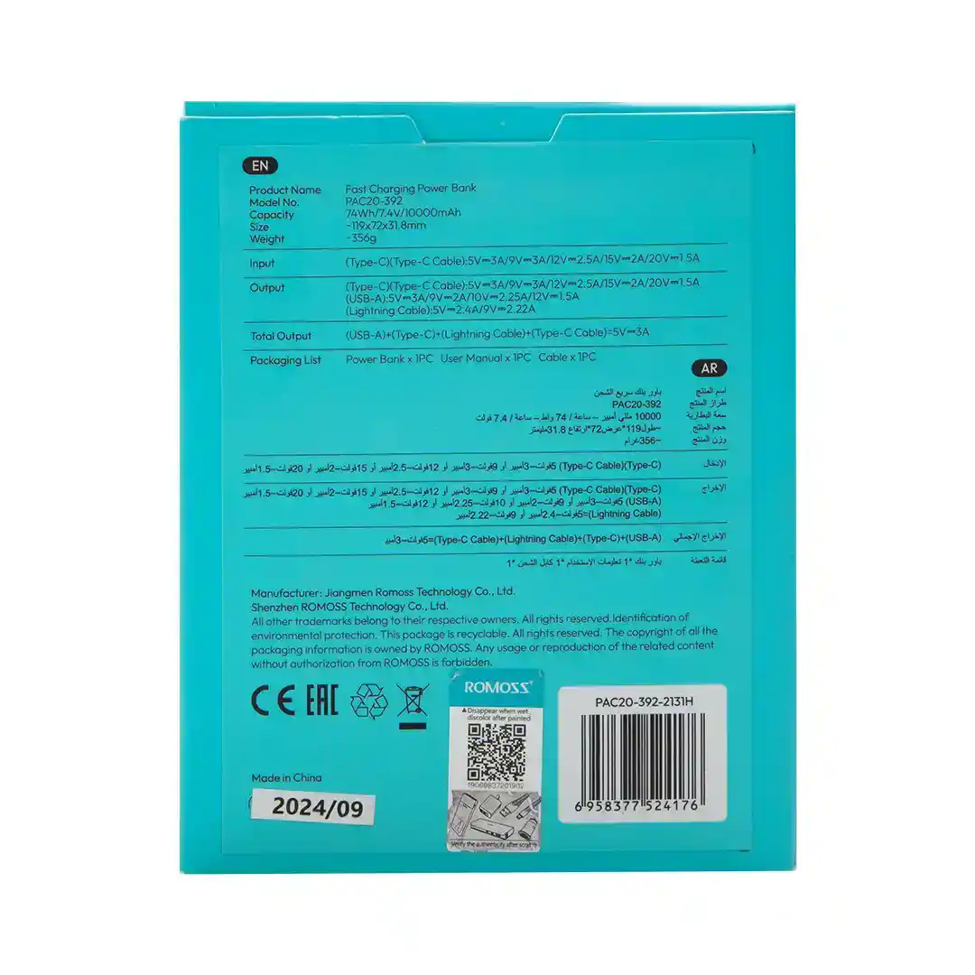 ROMOSS 30W PD 4 Output with Type-C & Lightning Cable Power Bank, 20000mAh PAC20-392