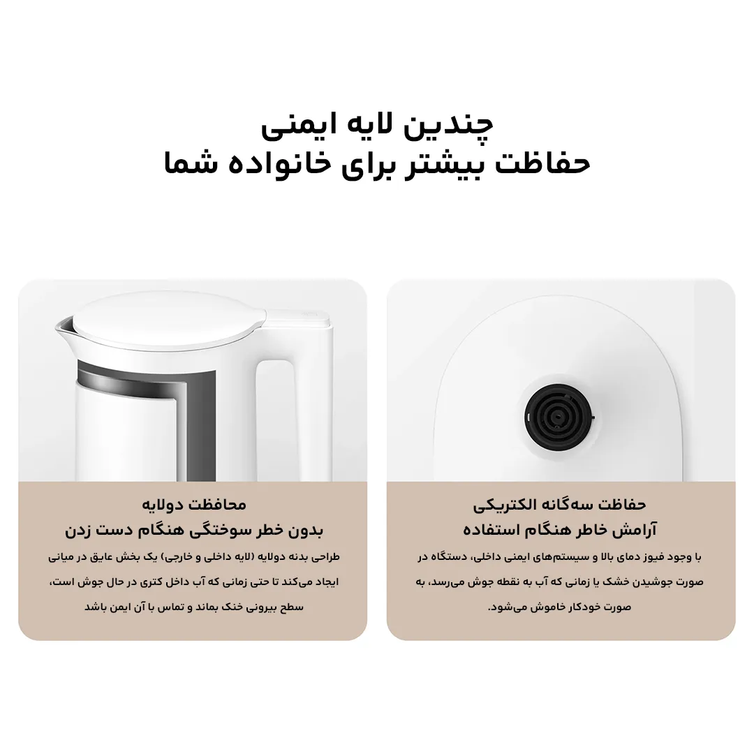 - محافظت الکتریکی سهگانه: سیستم خاموشی خودکار + سیستم جلوگیری از جوش خشک (خالی بودن کتری) + فیوز حرارتی دمای بالا