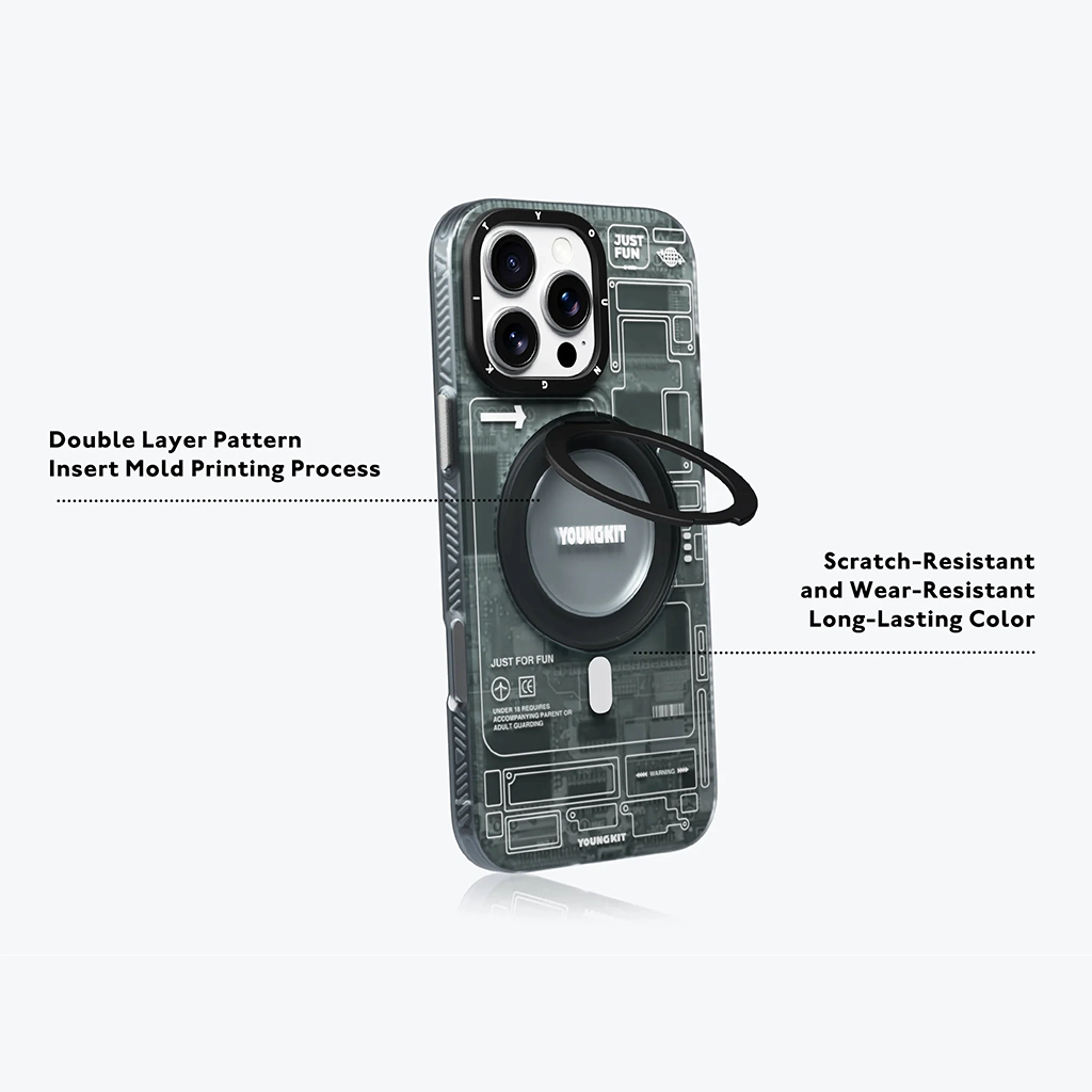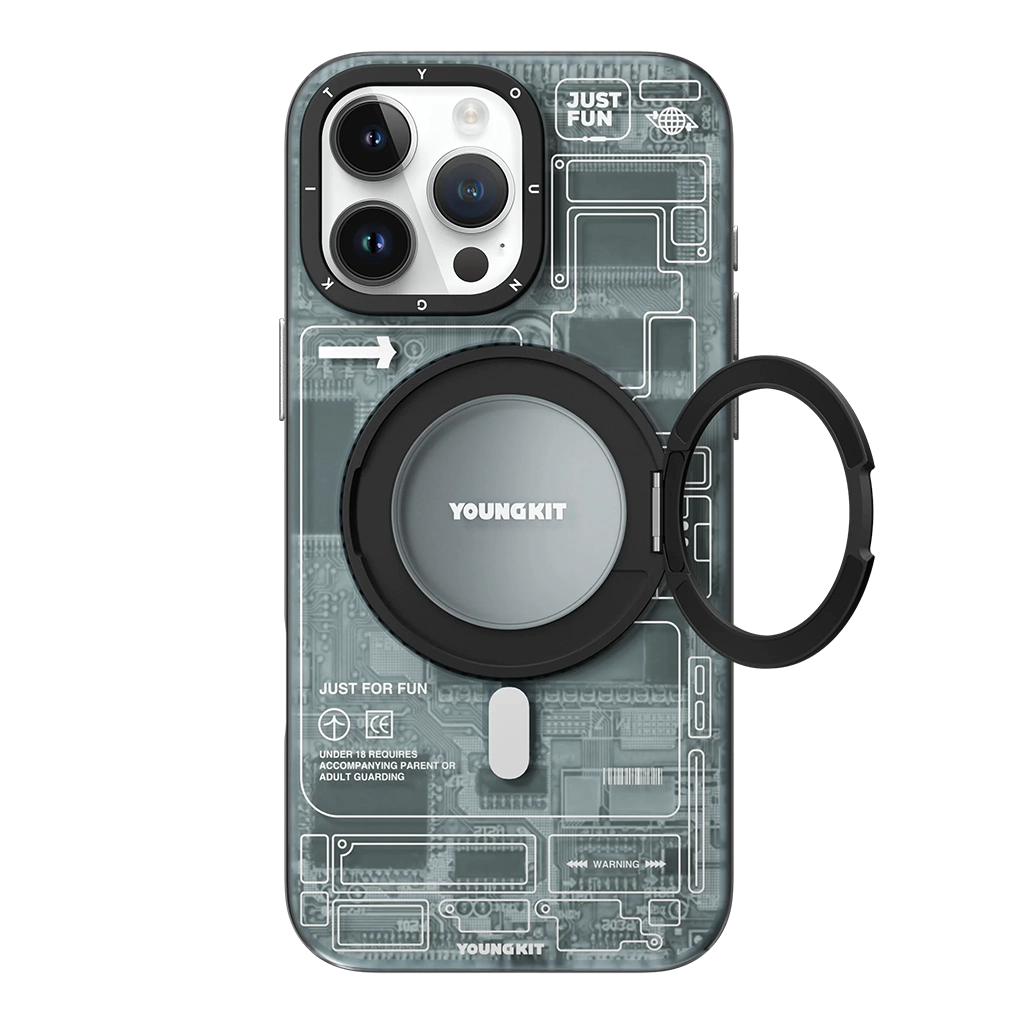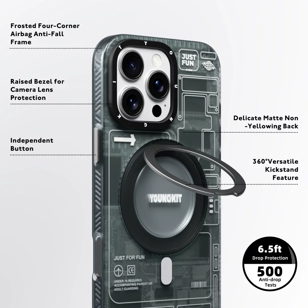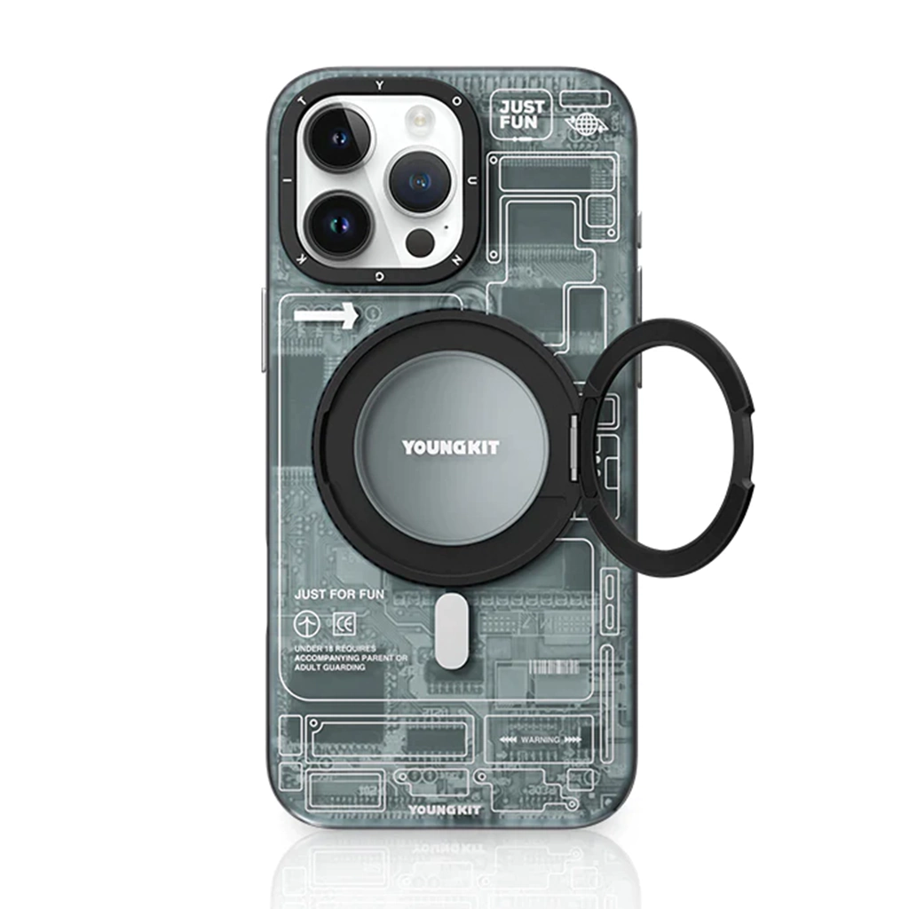 YOUNGKIT Technology Series Futuristic Grey Circuit Board 360 Rotation Ring Stand Magsafe Case for iPhone 16 Pro Max Original